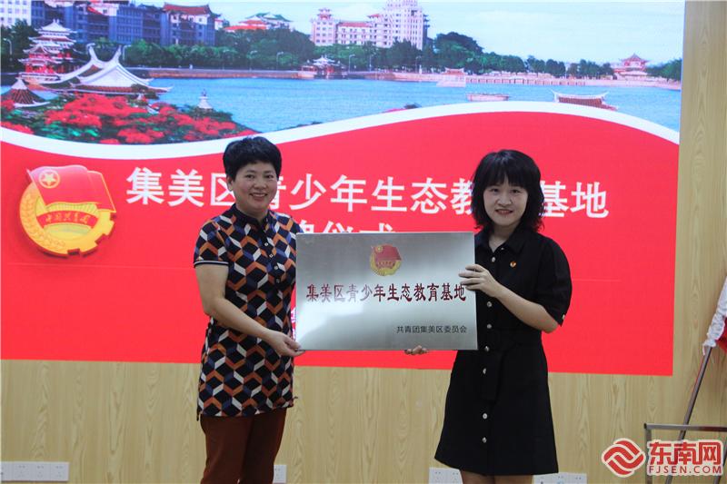 集美团区委书记张晓蕾为莲亭社区授予集美区青少年生态教育基地牌匾。(东南网记者 李霖 摄)