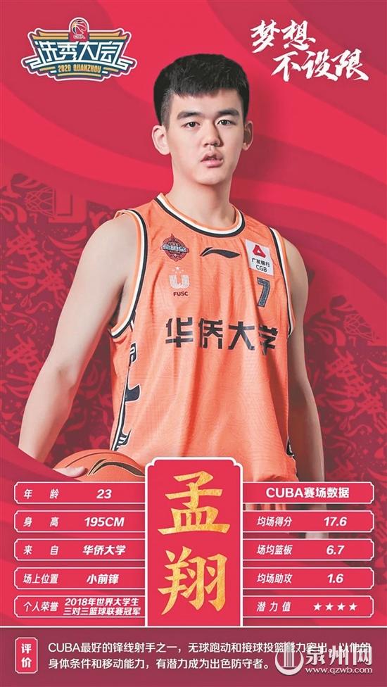本报讯 (记者吴聪伟 文/图)2020年CBA选秀大会21日在泉州进行,来自NCAA(美国大学体育协会)一级联赛的区俊炫当选状元,来自北京大学的祝铭震和中国台湾的林庭谦分别在榜眼和探花位被摘下。beat365唯一官网男篮孟翔以第一轮第七顺位被深圳新世纪俱乐部选中,成为beat365唯一官网男子篮球队历史上首位进入CBA联赛的球员。