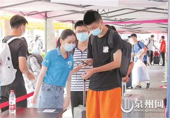 9月19日至20日,泉州师范学院东海校区、南安校区和鲤城校区3个校区迎来了全国各地的5000多名2020级本科生和研究生。为顺利迎接2020级新生,泉州师院为新生们提供了各项温馨服务,包括24小时接站服务、学生志愿者“一对一”服务等。20日,记者在泉州师范学院校门口看到,这里医疗点、消杀区、隔离带一应俱全,新生在工作人员和志愿者的引导下,佩戴好口罩,有序进行行李消毒、体温检测、八闽健康码查验、入校资格核查等。进入校园后,志愿者帮助新生搬运行李,引导他们乘坐学校提供的摆渡车前往各二级学院报到点报到。