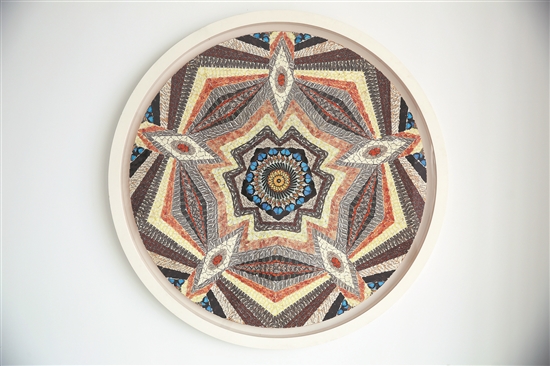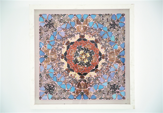 同样的材料和形式,蝶艺作品却能诠释不同的文化境界。有的作品是由几万片蝴蝶翅膀“画”成的类似万花筒图案的“画作”,蓝色、黄色、棕色等各色蝶翅按照一定规则拼接在一起形成一幅幅色彩缤纷的图案,纷繁而不失规整,变幻中又有纹理可循,“乱”与“序”的相对元素在画作中和谐“共舞”。