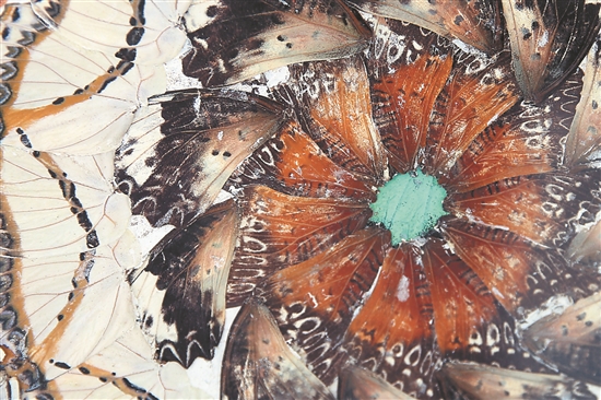 蓝色、黄色、棕色等各色蝶翅拼接成色彩缤纷的图案。