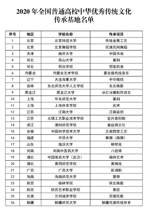 为深入贯彻落实习近平总书记关于教育的重要论述和全国教育大会精神,推进中华优秀传统文化全方位融入高校教育,根据《教育部关于开展中华优秀传统文化传承基地建设的通知》(教体艺函〔2018〕5号)和《教育部办公厅关于开展2020年中华优秀传统文化传承基地遴选工作的通知》(教体艺厅函〔2020〕16号),经高校自主申报、省级教育行政部门推荐、专家遴选与公示,教育部认定26个基地为2020年全国普通高校中华优秀传统文化传承基地(名单见附件),现予以公布。