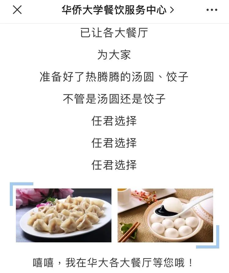 尽管身边有老师同学,但每逢佳节难免倍思亲。所幸华大食堂总是及时推出属于节日的味道,冬至的饺子、汤圆、羊肉,中秋的华大专属款月饼,入秋了甚至还能吃到大闸蟹……在每个想家的日子里,安抚大家的胃,让学校慢慢变成了我们的第二故乡。