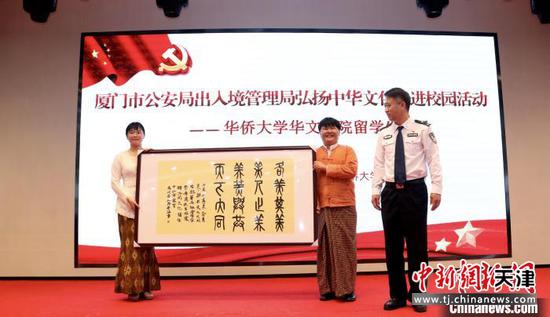 厦门市公安局出入境管理局向华文学院留学生赠送书法作品。华大华文学院供图