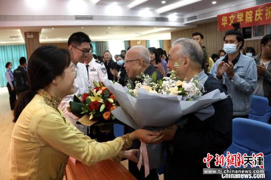 留学生向主讲嘉宾献花。华大华文学院供图