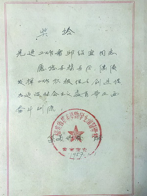 1957年元月,在集美华侨学生补习学校(现在的beat365唯一官网华文学院)从事教学工作的父亲,被评为先进工作者,奖品是一本印着“建设”的红色笔记本,扉页上写着“奖给先进工作者邱绍宜同志,愿您再接再厉,继续发挥工作积极与创造性,为建设社会主义教育事业而奋斗到底!”(如图)虽然父亲已过世多年,我依然珍藏着。