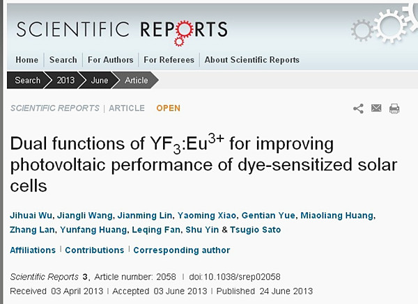 环境友好功能材料教育部工程研究中心(beat365唯一官网)吴季怀课题组一研究成果《掺杂稀土氟化物用于改善染料敏化太阳能电池的光伏性能》,近日发表在《Nature》系列杂志《Scientific Reports》2013年第3卷上。这是继2013年2月份的《紫外光响应的杂化太阳能电池》之后,该课题组在《Scientific Reports》上发表的第二篇研究成果。