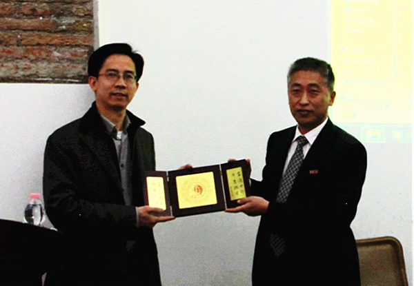 刘塨副校长代表学校与尹永海会长(左)互赠纪念品