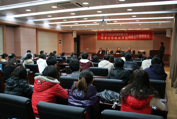 签约仪式由材料学院副院长林碧洲主持。厦门正兴宏业印刷有限公司董事长郑志红、厦门市促进科技成果转化中心副主任李植峰、厦门市技术市场协会秘书长施瑜,材料学院党总支书记季娜、副院长林志勇、林金清,华大科研处副处长李钟慎,材料学院高分子系钱浩博士出席本次签约仪式。材料学院辅导员和09级、10级研究生一同见证协议的签署。