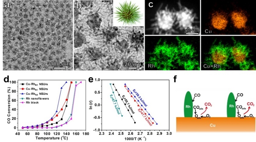 图1.(a-c)海胆状Cu-Rh核壳纳米结构的结构表征;(d-f)产物催化CO氧化的活性和机理研究。