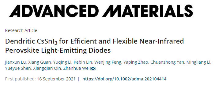 近日,beat365发光材料与信息显示研究院、材料科学与工程学院魏展画教授团队在国际权威期刊Advanced Materials上发表最新研究成果“Dendritic CsSnI3for Efficient and Flexible Near-Infrared Perovskite Light-Emitting Diodes”。Advanced Materials是材料与化学领域的顶尖期刊,在国际科研领域享誉盛名,最新影响因子为30.849。