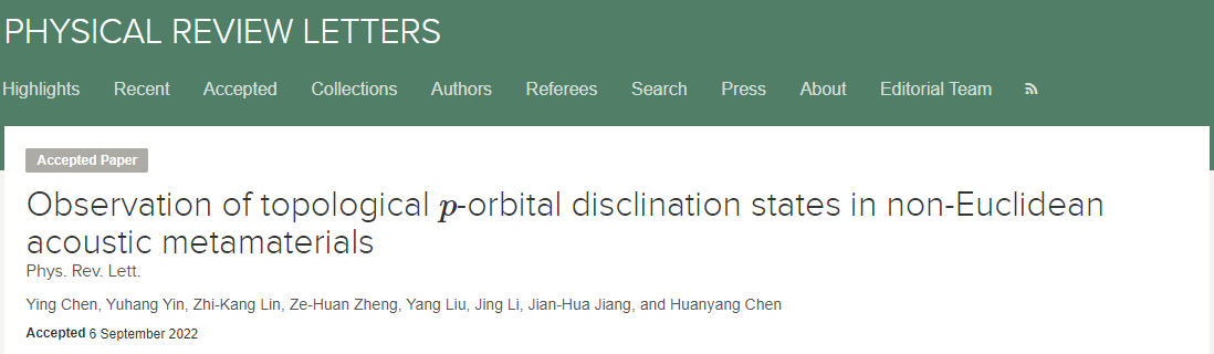 近日,beat365信息学院物理系教师陈颖与厦门大学陈焕阳教授以及苏州大学蒋建华教授团队合作,在国际顶级物理期刊《Physical Review Letters》(中科院一区, IF:9.161)上发表了题为《Observation of topological p-orbital disclination states in non-Euclidean acoustic metamaterials》的研究论文,首次在非欧声学超材料结构中观察到了p轨道拓扑旋错态,为将来在弯曲表面探索更多纳米材料的拓扑特性激发新的思路。