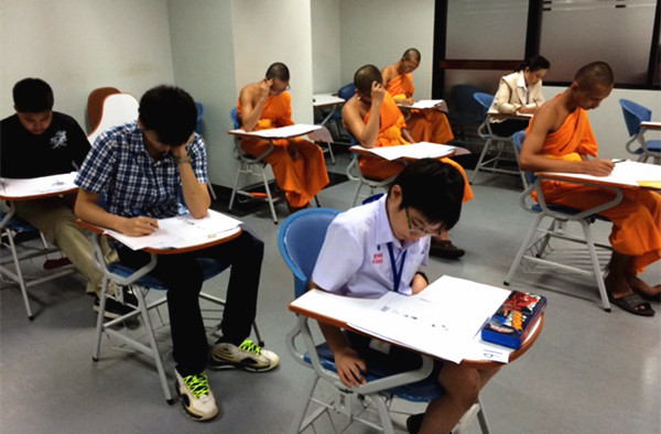 在汉语热的背景下,本次HSK考试吸引了各个年龄段和社会阶层人士参加,主要是学生和热爱汉语的社会人士,其中有十几岁的小孩子和六十多岁的老人,最引人注目的是有几名僧侣也前来孔子学院考点参加考试。HSK考试成为他们检验汉语学习成果,就业深造的必要条件。现场还有来自泰国农业大学孔子学院社会班的学员,他们表示参加社会班学习很有效果,希望自己的努力学习能通过较高等级的HSK考试。