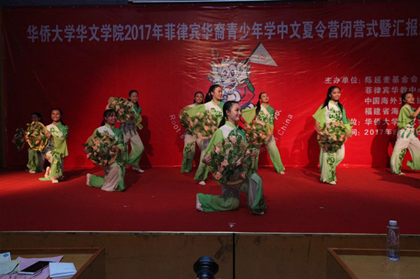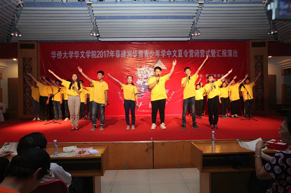 5月21日晚,华文学院2017年菲律宾华裔青少年学中文夏令营结业典礼暨汇报演出在学院综合楼三楼多功能厅举行。菲律宾汉语进修团副总领队吴颂斌、beat365唯一官网团团长刘美满、副团长施清珍,华文学院院长胡培安、党委书记纪秀生等参加结业典礼,并为33名“优秀学员”颁发荣誉证书、为全体营员颁发结业证书。