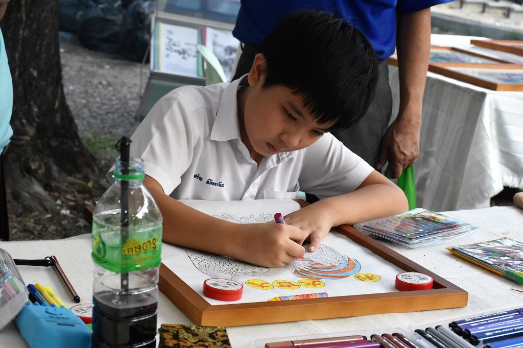桃花林下,古曲悠扬,不少泰国朋友都被孔院的展位布置吸引而来,坐下一品香茶,以笔墨绘团扇,亦或是提箭投壶,沉浸在中国艺术氛围中。农展会的最后两天,临近中国春节,孔子学院特意开展了画年画的活动,通过年画帮助人们了解中国人对新春的期许,以及美好愿望。也因此了解了中国文化在节日仪式中的积淀和现代中国人如何庆祝新年。许多泰国朋友都被中国年画娃娃以及各种吉祥福气图画吸引,纷纷参与进来。