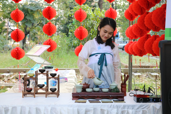 活动现场,孔院为游客们准备了铁观音、八宝茶等多种茶体验。一位游客在孔院展位前坐了很久,体会沁入心脾的茶味,他说:“爸爸妈妈几十年前从潮州回来之后,也带来了一些潮州人的习惯,所以平时在家里也经常喝一些茶,看到有孔院的老师泡茶,我感到很亲切。”