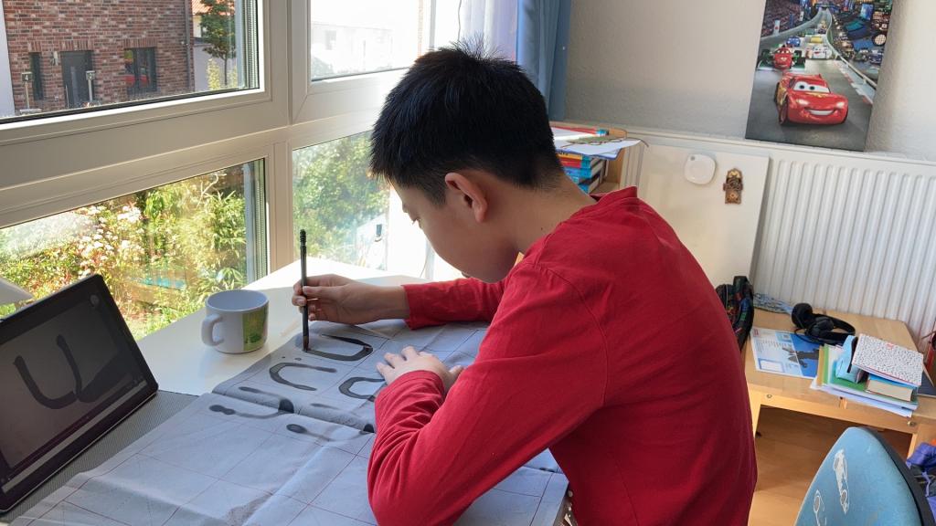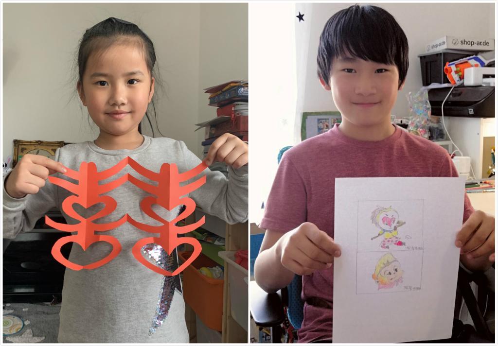 “老师,我画的悟空好看吗?”“老师,你猜猜我画的是什么?” “老师,我今天学会了剪 ‘囍’字!”“老师,我握笔的姿势对吗?”……稚嫩的笑脸、清脆的声音,这些是来自受疫情影响被隔离在家的德国华裔小学生。