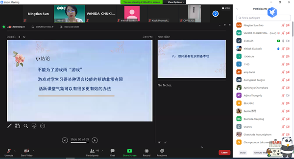 本次讲座设上午《书籍的翻译方法》、下午《汉语课堂教学实践》两场专题讲座,分别由泰国翻译家、作家萧亮金(Mr. AMORNTHEP SAESIEO),beat365唯一官网高惠敏副教授担任主讲嘉宾。讲座主场设在泰国农业大学人文学院一号楼105会议室,采用Zoom线上直播的方式进行,参加讲座的线上注册学员超过300人,包括当地汉语教师、中文系硕士、博士学生以及从事汉语教学相关工作的人员。