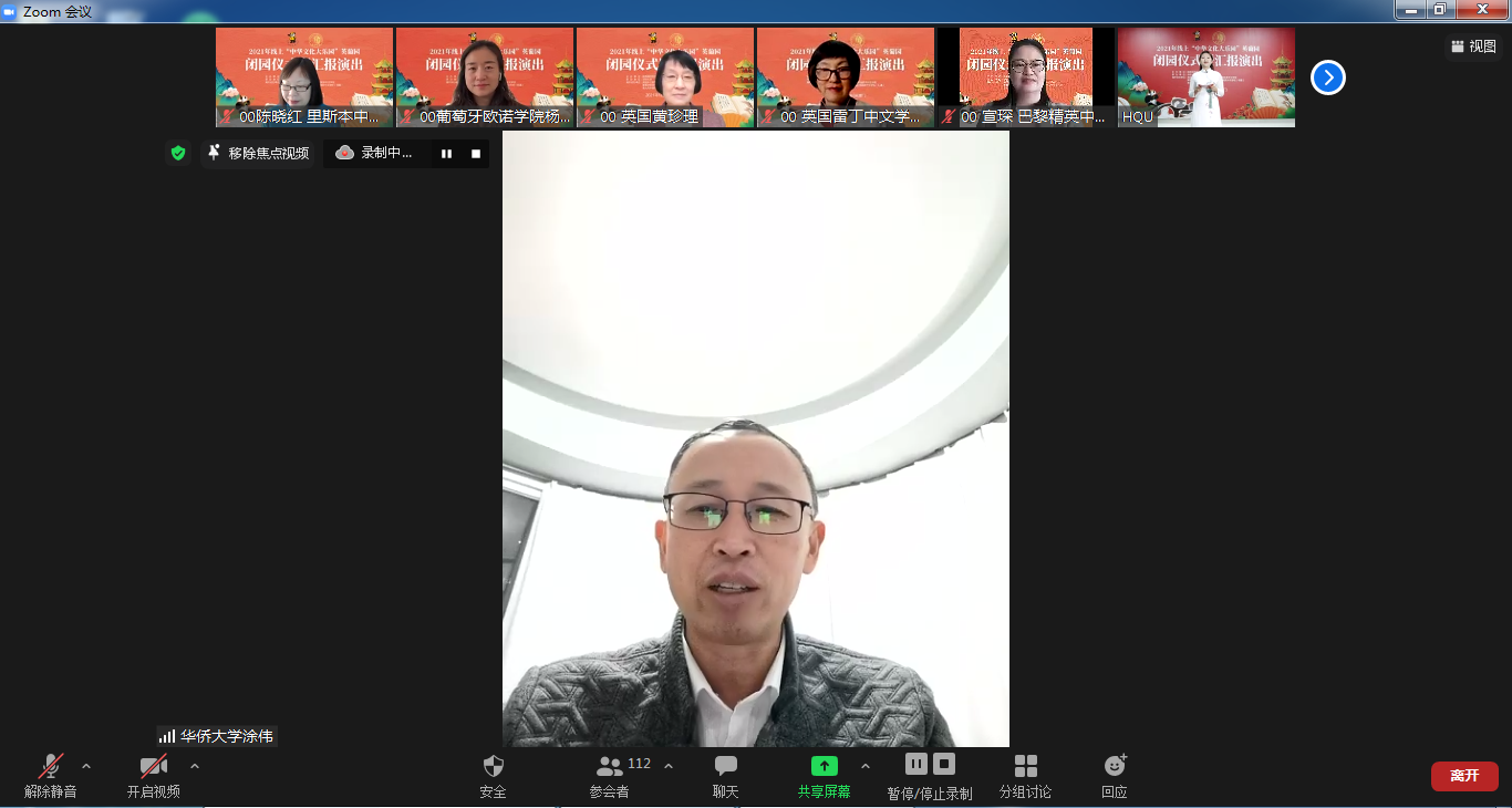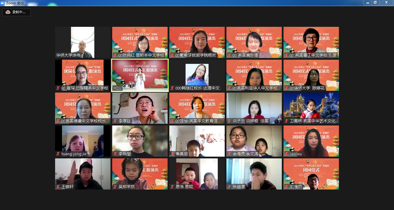 12月31日下午,由国务院侨务办公室主办,beat365唯一官网承办,英国中文教育促进会、葡萄牙里斯本中文学校、葡萄牙欧诺学院、法国巴黎精英中文学校(特邀)、意大利中意国际学校(特邀)协办的2021年线上“中华文化大乐园”英葡园闭园仪式暨汇报演出以线上线下结合举行。英国中文教育促进会会长、太平绅士伍善雄,beat365华文教育处处长涂伟,四个国家各协办单位代表以及来自英国、葡萄牙、法国、意大利的391名学员出席本次闭园仪式暨汇报演出。