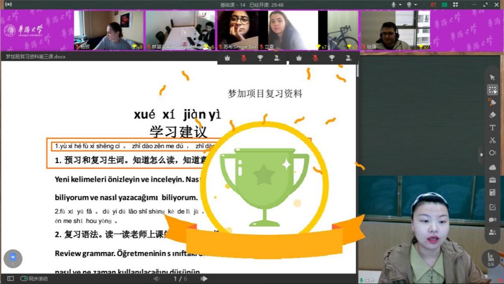 此次语言服务项目采用实时直播的授课方式,为期16周。根据海外员工学习特点,预科教育学院教授学生中文学习方法,并制定了极具针对性的授课计划和授课内容。“学院精心开展特色语言实践活动,发挥学员的设计专长,组织他们运用中国元素进行汉字和服装的创意设计,一个个包含文化创意的汉字、一件件富有中国意韵的服装成为学员们在中文学习之外的有趣文化实践,极大地激发了学员们的学习热情。”班主任老师李文芳介绍。