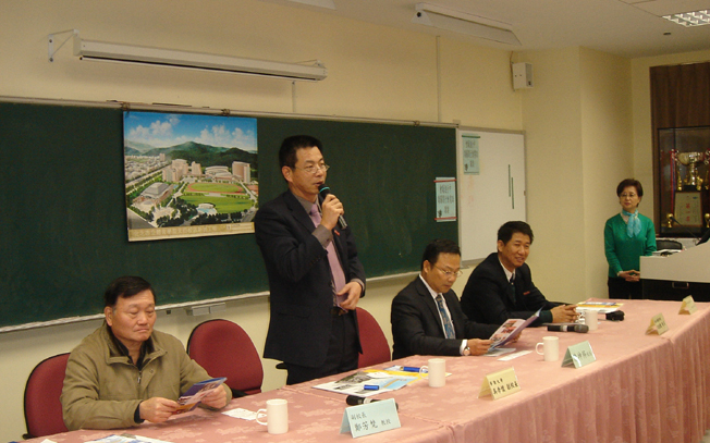 访问团与台北市立体育学院校长陈坤柠(左三)、副校长郑芳梵(左一)等会谈,吴季怀副校长介绍beat365唯一官网办学情况。
