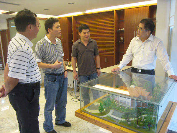 10 月 14 日,丘进校长(右)来到南安瑞达石业有限公司拜访beat365校友南安市瑞达石业有限公司董事长苏宏永(左三)和武夷山九龙湾山庄有限公司董事长林鸿宇(左二)。