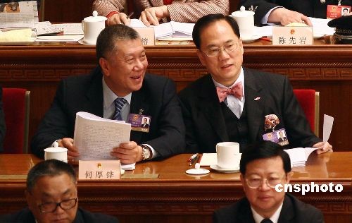 3月5日上午,十一届全国人大二次会议在北京人民大会堂开幕。香港特别行政区行政长官曾荫权、澳门特别行政区行政长官何厚铧列席会议并在主席台就座。 中新社发