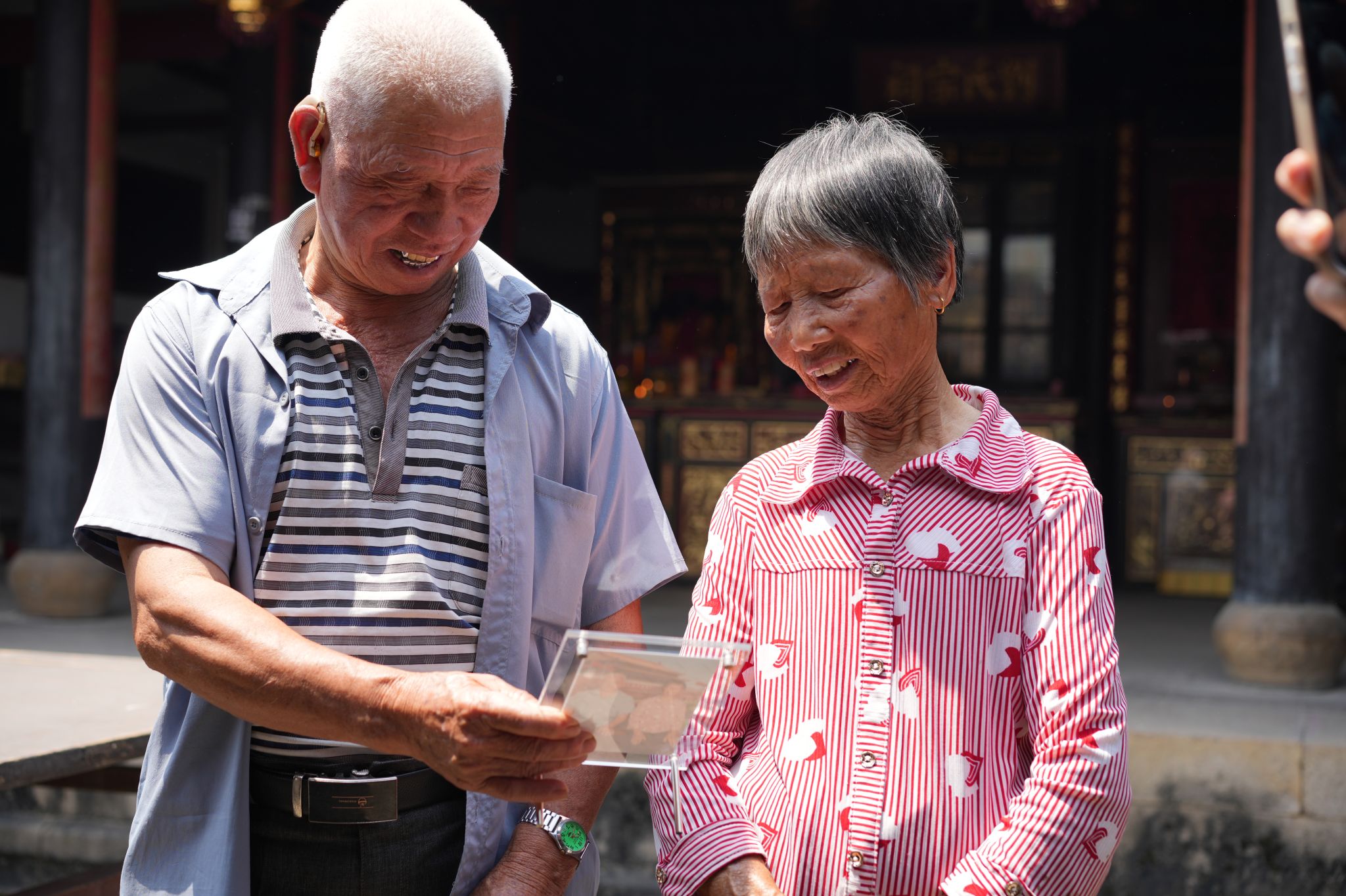老人欣赏自己的合影