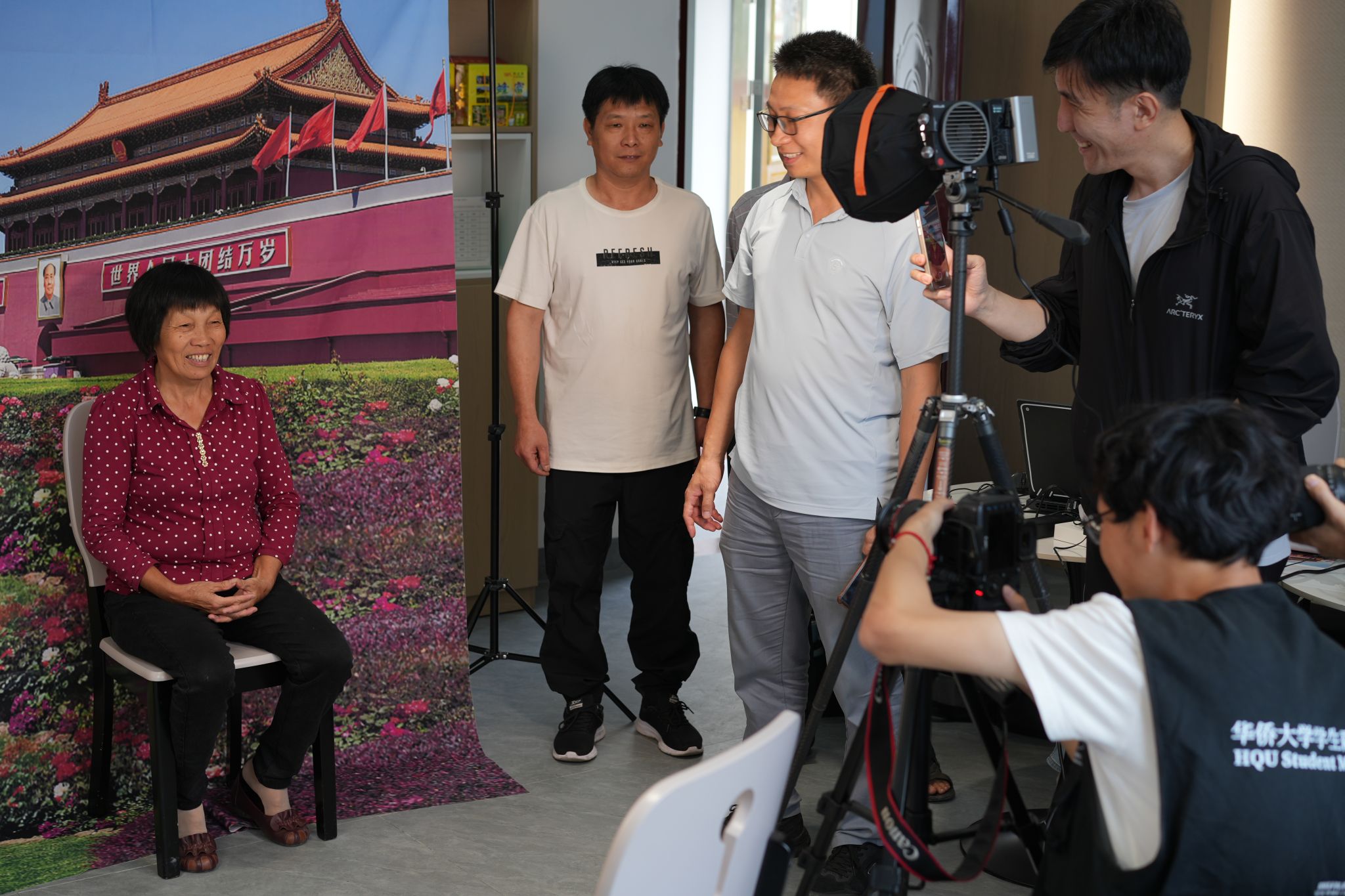 在拍摄现场,同学们耐心与老人互动,或整理妆发、或指导动作。而在精心搭建的幕布背景前,老人们面带微笑,感受这次新鲜的拍摄体验。