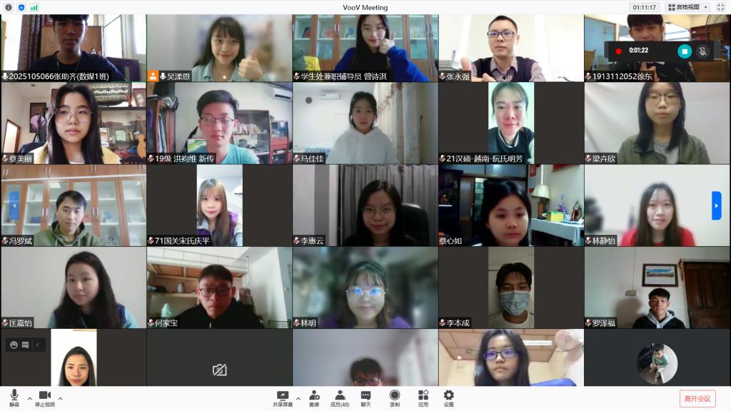 嘉庚学堂班主任张永强老师作总结发言。他首先肯定了嘉庚学堂班委们一学期的辛苦工作,给嘉庚学堂全体学员搭建了各式各样的学习生活交流平台,有效团结了身在海外的嘉庚奖学金获得者。其次,他鼓励全体学员积极参与学校举办的各类活动,在活动中用实际行动传承和弘扬嘉庚精神。最后,他提醒海外的同学们在遵守疫情防控要求、保重身体健康的情况下努力学习,遇到困难要及时向老师们反馈,学校会尽力给大家提供帮助。