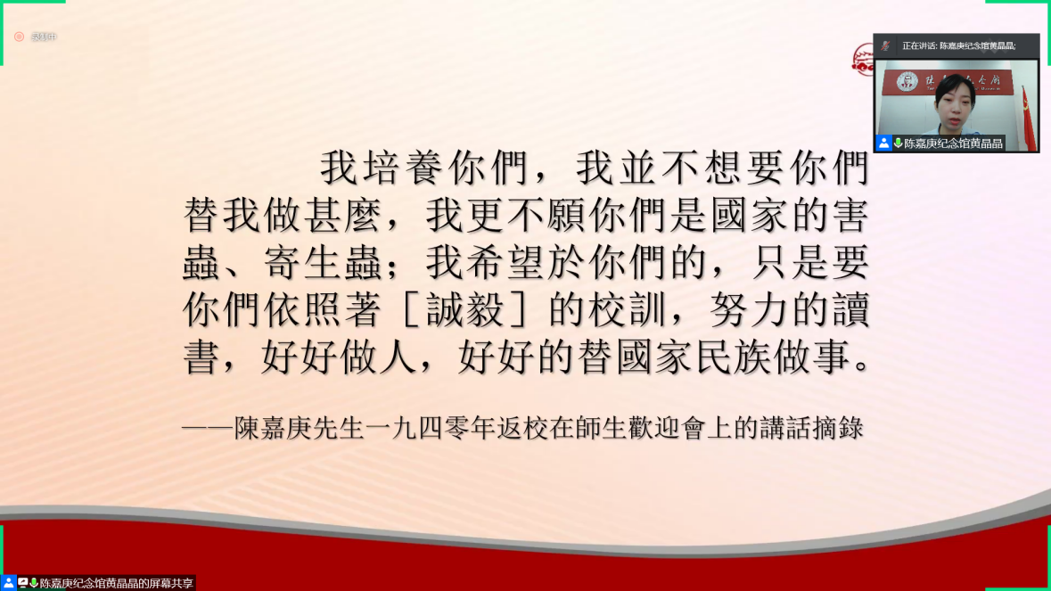陈嘉庚纪念馆黄晶晶以嘉庚先生的语录勉励大家