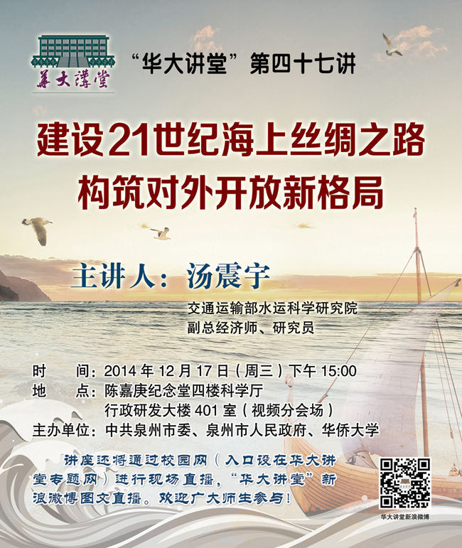 预告:“华大讲堂”第47讲:交通运输部水运科学研究院副总经济师、研究员《建设21世纪海上丝绸之路构筑对外开放新格局》