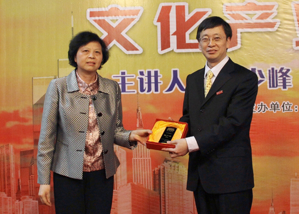 潘燕燕副市长为陈少峰教授颁发华大讲堂主讲嘉宾纪念牌