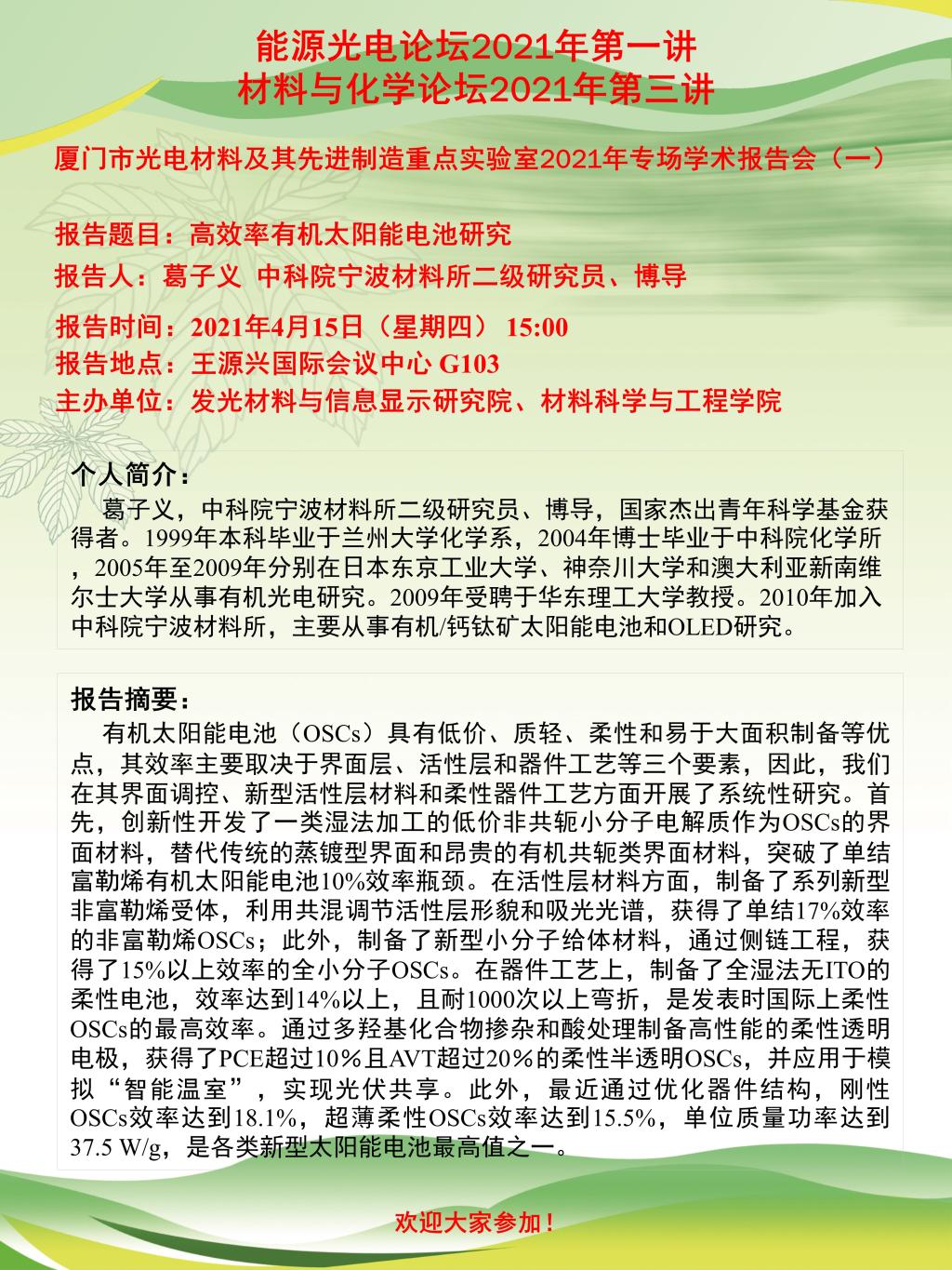 能源光电论坛2021年第一讲、材料与化学论坛2021年第三讲:高效率有机太阳能电池研究