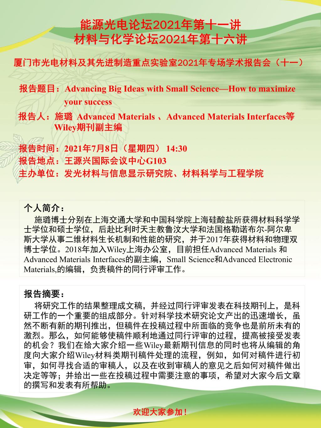 能源光电论坛2021年第十一讲暨材料与化学论坛2021年第十六讲