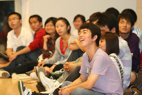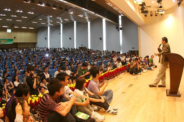 7日晚7时,拥有600人座席的王源兴国际会议中心学术报告厅已座无虚席。厅内的过道、走廊、台上、台下全挤满了听众,同学们或席地而坐,或靠墙站立,平静有序地等待着讲座的开始。当晚担纲演讲的分别是“美式口语教父”王强和新东方教育科技集团董事长、新东方创始人俞敏洪。