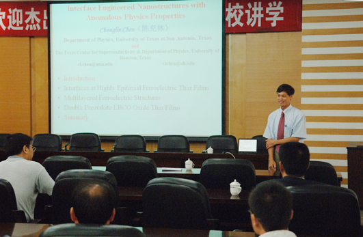 陈充林教授介绍了他十多年来对纳米超材料的研究成果,重点说明了界面工程材料在控制超纳米材料物理属性和发现有源器件和纳米系统工程新材料物理现象方面起到的重要作用,全面介绍了( Pb,Sr ) TiO3 、 LaBaCo2O6 、 Ba(Zr,Ti)O 3 等材料的物理特性和在高科技领域方面的应用。陈教授的讲座论述精辟,实例丰富,开拓了师生的科研视野。讲座结束后,陈教授对师生们的提问一一作出解答。